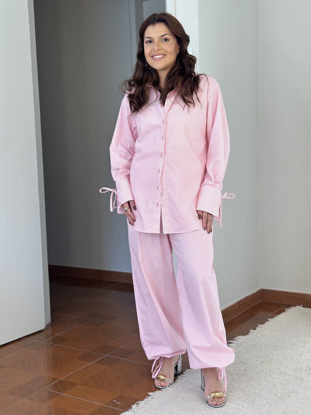 A confeccionado em tricoline, composto por 100% algodão. A peça apresenta modelagem oversized o corpo com comprimento longo. Abotoamento central e nos punhos com botões no mesmo tom, detalhe para os bordado com a inicial da marca nos punhos.