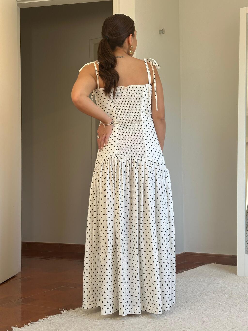 Vestido de tricoline com decote reto na frente e nas costas, com detalhe de lastex nas costas e alças regulaveis.